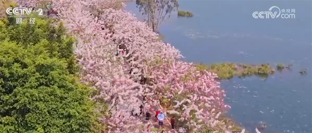 在石屏縣異龍湖,萬株神黃豆花鋪開粉色花海,花海與碧波蕩漾的湖水交相輝映。游客紛至沓來,盡享踏春美好時(shí)光。