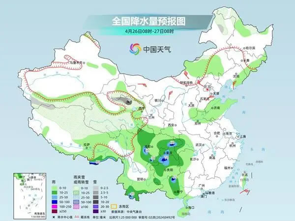明天,內(nèi)蒙古東北部、黑龍江西北部、新疆南疆南部山區(qū)、西藏北部、青海大部、甘肅祁連山區(qū)等地部分地區(qū)有小到中雪或雨夾雪,其中,青海北部等地部分地區(qū)有大雪;四川中東部、重慶、湖北西部、湖南西部、貴州、云南東部和南部、廣西中部、西藏東南部等地部分地區(qū)有中到大雨,其中,西藏東南部、四川盆地西南部、重慶北部、貴州西北部、廣西西北部等地部分地區(qū)有暴雨。