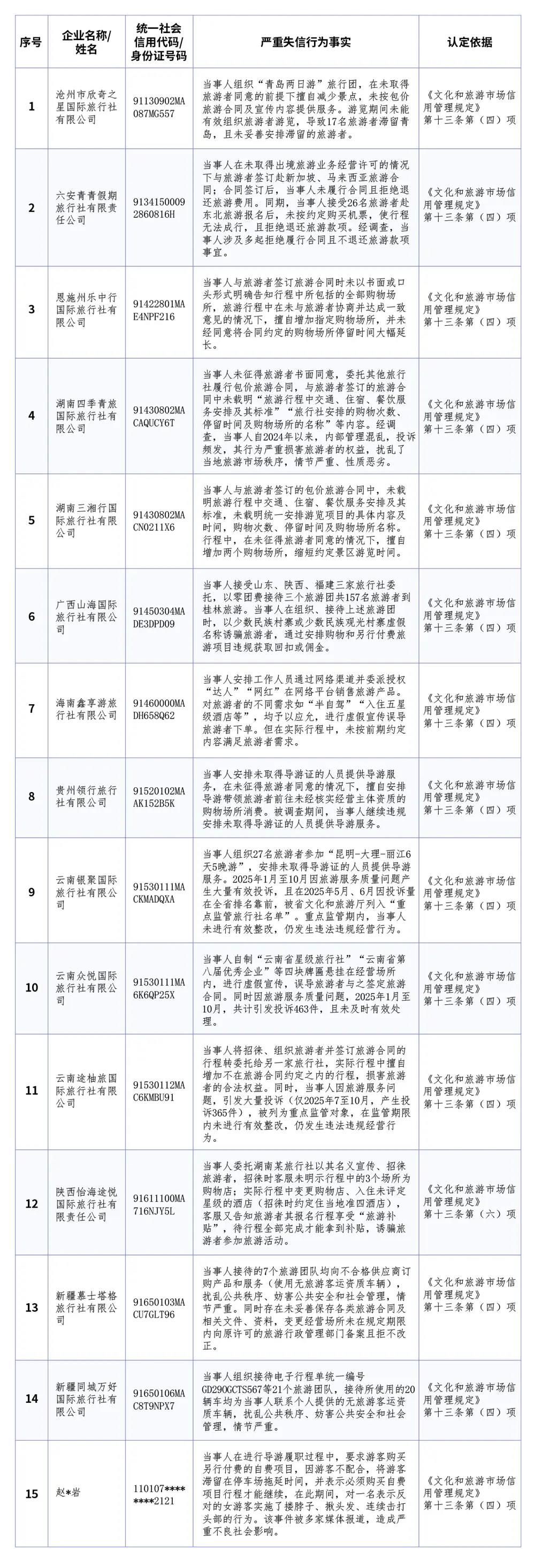 旅游市場(chǎng)秩序集中整治工作開(kāi)展以來(lái),各地依法查辦了一批重大案件,并依法依規(guī)開(kāi)展失信主體認(rèn)定,截至2026年3月底,全國(guó)文化和旅游市場(chǎng)共認(rèn)定失信主體1655個(gè)。為落實(shí)《國(guó)務(wù)院辦公廳關(guān)于進(jìn)一步加強(qiáng)旅游市場(chǎng)綜合監(jiān)管的通知》有關(guān)要求,提升信用監(jiān)管效能,營(yíng)造誠(chéng)信、公平、有序的旅游市場(chǎng)環(huán)境,現(xiàn)對(duì)旅游市場(chǎng)秩序集中整治嚴(yán)重失信主體典型名單(2026年第一批)予以公布。