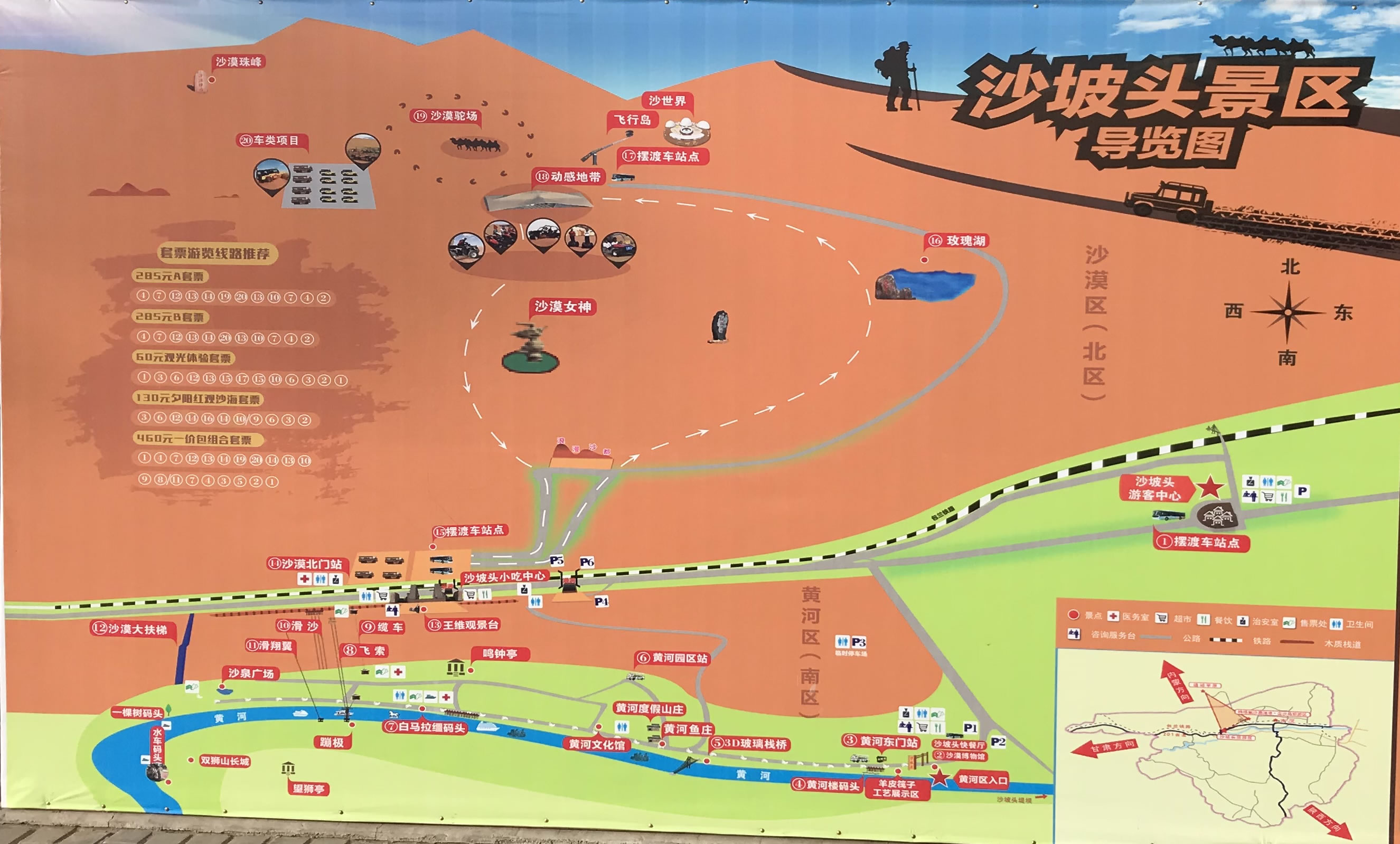 悠悠歲月,由古而今。天賜奇景與人們的不懈創(chuàng)造,使如今的沙坡頭已不是古時的沙陀頭,它融自然景觀、人文景觀、治沙成果于一體,被世人稱之為“世界沙都”、“世界壟斷性旅游資源”。在這里,“大漠孤煙直,長河落日圓”的古詩意境得到最完美的體現(xiàn);滑沙聽鐘,坡底戲泉,物我兩忘,其樂無窮;黃河弄筏,追波逐浪,驚險刺激;騎駝踏沙,體驗(yàn)沙海輕舟之浩渺,觀大漠日落日出之壯美;觀星賞月,聽沙漠夜聲之神秘;圍篝火,飲酒吃肉,狂歌勁舞,大漠探險神秘引人;古老的河灣水車,輪轉(zhuǎn)水瀉,澆田灌園,別有情趣;沙下果園,疊翠流紅,鳥語花香,瓜甜果艷,令人流連忘返;“一線牽南北”的雙架索道,可實(shí)現(xiàn)凌空跨河比翼雙飛的夢想;古老的黃河木帆船、赤背的纖夫,將“妹妹你坐船頭,哥哥我岸上走”的歌曲變?yōu)楝F(xiàn)實(shí)美的享受;空中飛行、高空跳傘走出影視蒙太奇,飄落沙山;沙雕、沙療、沙浴和沙漠球類、沙漠田徑等形式多樣的“沙”字號體育健身競技項(xiàng)目,融智慧、趣味、知識、健身為一體;民族風(fēng)情演出、黃河梨花節(jié)、大漠黃河國際旅游節(jié),形式新穎,內(nèi)容獨(dú)特。將在5月4日舉行的大漠舞龍大賽,百余條巨龍在浩瀚的騰格里大漠騰滾翻飛,場面恢宏,氣勢雄偉,鑼鼓震天,令人心動……這,就是今日之全新的沙坡頭旅游區(qū),2000年被國家評定為AAAA級旅游區(qū),它是寧夏人之驕傲,是馳名中外的旅游勝地。