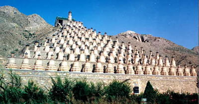 中國(guó)古代大型喇嘛塔群。在寧夏青銅峽市青銅峽水庫(kù)西岸山坡上。塔自上而下按 1、3、5、7、9……19奇數(shù)錯(cuò)落排列成12層,每層塔前用磚砌護(hù)墻一道,地面用磚鋪墁,構(gòu)成一個(gè)等邊三角形塔群,共