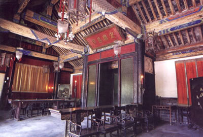 堂內(nèi)兩旁及后部陳列著正一品爵位的儀仗。如金瓜、朝天鐙、曲槍、雀槍、鉤連槍、更鼓、云牌、龍 旗、鳳旗、虎旗、傘、扇等還有一些象征其封爵和特權(quán)的紅底金字官銜牌,如