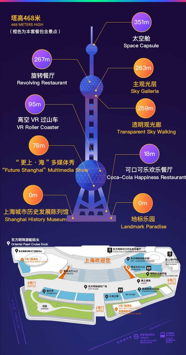 東方明珠廣播電視塔內(nèi)共有5個(gè)觀光層,主要由高90米、直徑50米的下球體室外觀光廊和高272.5米、直徑45米的上球體觀光層組成,是鳥(niǎo)瞰上海全市的最佳場(chǎng)所之一。
