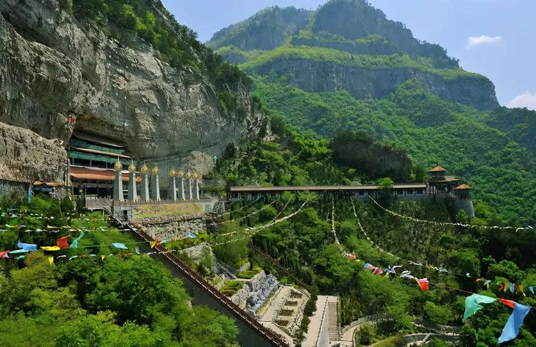 云峰寺,原名抱腹寺,因建于抱腹巖而得名。始建于三國曹魏時(shí)期,高僧迪公經(jīng)營始建,距今一千七百余年。抱腹巖坐東面西,高60米,深50米,長180米,分上下兩層,抱二百余間殿宇、館舍于“腹”內(nèi),容兩千年歷史文明于其間,為天下“絕無僅有”。主要景點(diǎn)有毗盧殿、玉皇閣、空王殿、五龍殿、迪公洞、鸞公洞、志超洞、五龍松、鐵索嶺、《大唐汾洲抱腹寺碑》等四十余處。寺內(nèi)供奉有當(dāng)?shù)卣嫔窠樽油、真佛空王佛。田志超是漢人第一個(gè)成佛的,塑像為包骨真身。寺內(nèi)還保存有許多唐、宋、元、明碑刻、雕塑,具有很高的文物價(jià)值。抱腹巖頂壁掛鈴,場面驚心動魄,令人贊嘆叫絕。鐵索嶺是天下最古老的攀崖鐵索棧道。鐵索嶺的鐵索和下方云梯懸掛于唐代之前,是唐代大詩人賀知章當(dāng)年登山的一條險(xiǎn)徑。明末清初大學(xué)者傅山于崇禎十年(1637)題寫的長聯(lián),清光緒三年(1877)皇帝所賜“慈云法雨”御匾,以及當(dāng)代著名學(xué)者邑人張頷所題“抱腹棲云”的匾額,都是不可多得的珍品。