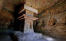 塔柱上層為四面立佛,四角各有一座大象馱立的九層鏤空塔柱,倚塔內(nèi)側(cè)站立著8身脅侍菩薩,與四立佛等高呼應(yīng)。在南壁的窟門(mén)與明窗之間,雕有一個(gè)大型屋形龕。屋檐帷幕之下,端坐著三位姿態(tài)各異的圣者,他們分別是釋迦、文殊和維摩詰。佛結(jié)跏坐在中央的須彌座上,施無(wú)畏與愿手印,靜靜傾聽(tīng);文殊菩薩在佛右側(cè),半跨坐榻,雙手動(dòng)作似在言說(shuō);佛左側(cè)的維摩居士,頭戴尖頂帽,身著大氅,右手舉麈尾,側(cè)身似與菩薩對(duì)話。此幅浮雕畫(huà)面,表現(xiàn)的是《維摩詰經(jīng)》第十一“菩薩行品”的故事情節(jié)。