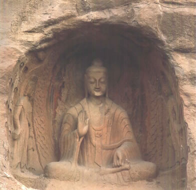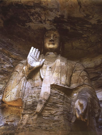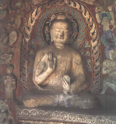 第19窟主佛像結(jié)跏趺坐,佛像耳輪齊肩,下頜崩毀,著袒右肩袈裟,輕薄貼體,衣紋簡(jiǎn)潔明快。佛像右手舉胸施無(wú)畏印,左手掌心向上握法衣于膝上,以表達(dá)佛法的無(wú)畏與傳承?咄鈻|西耳洞中,各雕刻一尊倚坐佛像,西耳洞佛像,耳廓寬大垂肩,體魄挺拔勁健。這種分窟安置三世佛的布局設(shè)計(jì),既有變化,又顯莊嚴(yán),是北朝石窟形制的新創(chuàng)舉。