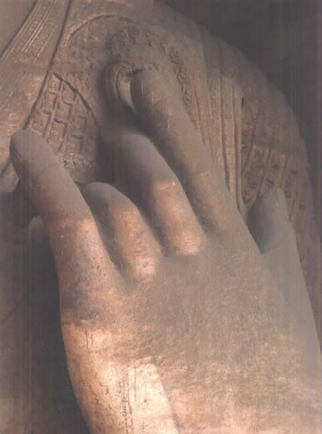 露天大佛高約13.7米,端坐于石臺(tái)座之上。佛首磨光肉髻,方圓面相,廣額豐頤,眉眼細(xì)長(zhǎng),鼻梁挺直,大耳垂肩;眉間施白毫,嘴唇略薄,唇上、下巴有八字胡須。眼中瞳孔為琉璃鑲嵌,大約是在遼代安裝。佛身挺拔壯碩,兩肩寬厚,著袒右肩式袈裟。袈裟質(zhì)地厚重,衣褶自然流暢,具有犍陀羅造像遺風(fēng)。大佛內(nèi)衣輕薄貼體,整體疏密得當(dāng),雕刻工藝精湛。大佛神情莊嚴(yán),慈祥泰然,結(jié)跏趺坐,雙手于腹間相會(huì)疊加,呈禪定手印。可惜手部與雙腿風(fēng)雨侵蝕,雕飾全無(wú)。但是大佛姿態(tài)雄偉,氣宇軒昂,生氣勃勃,融合東西方雕塑藝術(shù)于一體,是兼?zhèn)淞朔鹜印叭、八十種隨形好”的造像珍品。