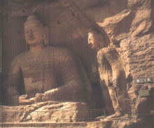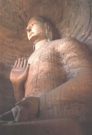早期石窟:即今第16~20窟,亦稱(chēng)為曇曜五窟。根據(jù)《魏書(shū)·釋老志》(卷114)記載:“和平初,師賢卒。曇耀代之,更名沙門(mén)統(tǒng)。初,曇耀于復(fù)法之明年,自中山被命赴京,值帝出,見(jiàn)于路,御馬前銜耀衣,時(shí)人以為馬識(shí)善人,帝后奉以師禮。曇曜白帝,於京城西武州塞,鑿山石壁,開(kāi)窟五所,鐫建佛像各一,高者七十尺,次六十尺,雕飾奇?zhèn),冠于一世。”文中記述的開(kāi)窟五所,就是當(dāng)時(shí)著名的高僧曇曜就選擇了鐘靈毓秀的武州山,開(kāi)鑿了雄偉壯觀的曇曜五窟,揭開(kāi)了云岡石窟開(kāi)鑿的序幕。第16~20窟即帝王象征的曇曜五窟,以造像的風(fēng)格和創(chuàng)作的技法來(lái)看,是云岡全窟群中最早的五個(gè)窟。平面為馬蹄形,穹隆頂,外壁滿雕千佛。主要造像為三世佛(過(guò)去、現(xiàn)在、未來(lái)),佛像高大,面相豐圓,高鼻深目,雙肩齊挺,顯示出一種勁健、渾厚、質(zhì)樸的造像作風(fēng)。其雕刻技藝?yán)^承并發(fā)展了漢代的優(yōu)秀傳統(tǒng),吸收并融合了古印度犍陀羅、秣菟羅藝術(shù)的精華,創(chuàng)造出具有獨(dú)特的藝術(shù)風(fēng)格,這是中外融合所形成的新的藝術(shù)風(fēng)格。