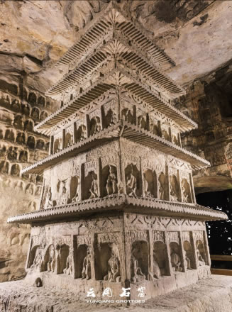 洞窟內(nèi)三級(jí)方形浮屠塔居中,塔面上刻出瓦筒、檐椽、斗拱等仿木建筑構(gòu)件,層層瓦壟出檐,上層四角鏤空雕刻八角棱柱,形成了周匝回廊,為研究北魏建筑提供了實(shí)物依。