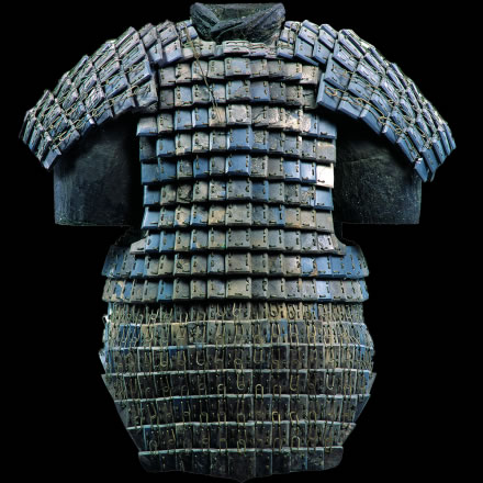 此展品為秦代的石器,通長(zhǎng)64.00厘米,出土于秦始皇帝陵K9801陪葬坑。鎧甲由前、后身甲和一對(duì)披膊組成,共有甲片380片。鎧甲的開合口位于右側(cè)肩、胸的交接處。