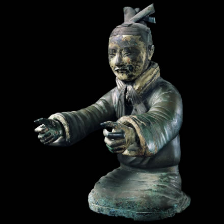 此展品為秦代的陶器,通高51.00厘米,重51.92千克,出土于秦始皇帝陵西側(cè)銅車馬陪葬坑,為秦陵二號(hào)銅馬車上的御官俑。御手通體彩繪,頭戴鹖冠,身穿長(zhǎng)襦,腰束革帶,下穿長(zhǎng)褲,與秦俑坑出土的高級(jí)軍吏俑相似,也是具有一定爵位的軍吏。 |