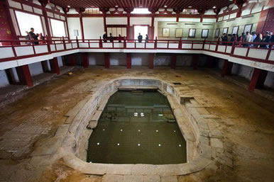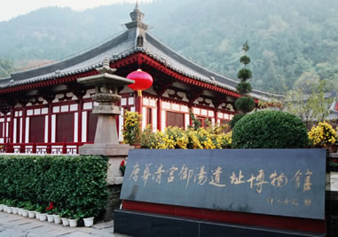 御湯遺跡:1982年4月,華清池內(nèi)基建時,在今“貴妃池”西側(cè)發(fā)現(xiàn)了古建筑基址,省文管會考古隊即開始發(fā)掘考證。用了3年多時間發(fā)掘了約4000平方米的面積,發(fā)現(xiàn)了一條長18米、寬5.1米的唐代蛇形水源通道和4座青石砌成的浴池,還有大殿基址4處,發(fā)現(xiàn)30多米長的石墻和兩處蓮花踏步,總長400多米的陶管水道,長50米的磚砌水道及建筑材料多件。1983年7月,考古工作者在溫泉總源北部發(fā)掘出一個東西長10.6米,南北寬6米,深1.5米。輪廓呈蓮花瓣形的浴池遺址,池底及四周均用青石鋪砌,池內(nèi)有兩層臺,池底南有兩個圓形水口。專家根據(jù)史籍記載華清宮的御池方位、形制、規(guī)模和發(fā)現(xiàn)的浴池四周的大殿基址和柱礎(chǔ)等,認為是唐玄宗使用的九龍殿蓮花湯。1984年10月在緊挨蓮花湯西北處,發(fā)掘出一個保存完好的海棠花形狀的浴池,東西長3.6米,南北寬2.9米,深1.26米,用青石砌成,池內(nèi)有二層臺階,池底正中有一圓形水口,做工考究,雕刻精細,專家認為是“海棠湯”,即唐玄宗御賜楊玉環(huán)的“貴妃池”。在蓮花湯西南還發(fā)掘出一個東西長5米,南北寬2.7米,深1.2米,用青石鋪砌的長方形浴池。據(jù)文獻記載推測,應(yīng)是“太子湯”。經(jīng)考證,這些古建筑遺存與史志書記載完全吻合,是一組較完整的唐華清宮建筑遺址,也是華清宮的中樞所在,為唐玄宗和貴妃游幸時活動的主要場所。期已經(jīng)全面整理,并仿唐形制,建成“唐華清宮御湯遺址博物館”供游人參觀。