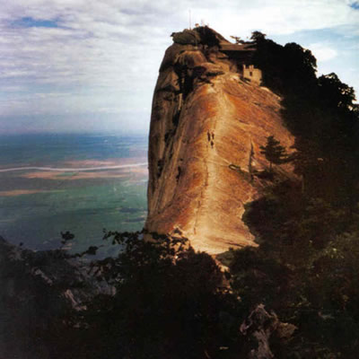 西峰海拔2082米,華山主峰之一,因位置居西得名。又因峰巔 有巨石形狀好似蓮花瓣,古代文人多稱其為蓮花峰、芙蓉峰。袁宏道在他的《華山永》中記述:“石葉上覆而橫裂”;徐霞客《游太華山日記》中也記述:“峰上石聳起,有石片覆其上,如荷花。”李白詩(shī)中有“石作蓮花云作臺(tái)”句,也當(dāng)指此石。