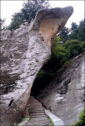 古時(shí)稱登東峰道路艱險(xiǎn),《三才圖會(huì)》記述說(shuō):山崗如削出的一面坡,高數(shù)十丈,上面僅鑿了幾個(gè)足窩,兩邊又無(wú)樹(shù)枝藤蔓可以攀援,登峰的人只有爬在崗石上,腳手并用才能到達(dá)峰巔。今已開(kāi)辟并拓寬幾條登峰臺(tái)階路,游人可安全到達(dá)。