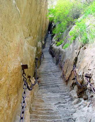“老君犁溝”同千尺幢、百尺峽一樣,是登華山的必經(jīng)險(xiǎn)道之一。今在犁溝的右上方,鑿成271個(gè)石級(jí),兩旁鐵鏈下垂,行走較為安全。