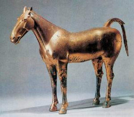 1981年5月在平陽公主墓南,西吳鄉(xiāng)竇馬村農(nóng)民在平整土地時(shí)發(fā)現(xiàn)這件文物。高62厘米,長76厘米,通體銅鑄鎏金,昂首,翹尾,四腿直立,體態(tài)矯健。頭部造型甚為生動(dòng),粉鼻亮眼,兩耳豎立。史書記載其為“金馬”,系以西漢時(shí)大宛國的汗血馬為原型而精制的工藝品。這件國寶,現(xiàn)收藏在茂陵博物館。