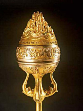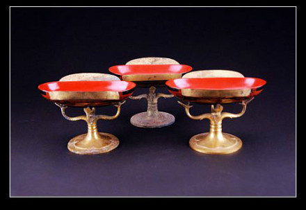 1981年5月茂陵一號無名冢南出土,整體分為座、杯上下兩部分,座為盤足,柿蒂狀支架,承托耳杯。酒杯平面呈橢圓形,圓形底,兩側(cè)附耳,紋飾華美,漆工與鎏金皆精湛,是研究西漢工藝美術(shù)史的珍貴實(shí)物資料。