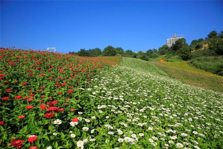 沿著小路拾級(jí)而上,百花爛漫,林木蔥郁,紅色的百日草、粉色的格桑花、紫色的薰衣草、嬌艷欲滴的虞美人、絢麗多姿的醉蝶......從山谷中傾瀉而下,如同一條彩色的小溪,置身其中,好似沉浸于花香鳥語的蝴蝶一般翩翩起舞、流連忘返。