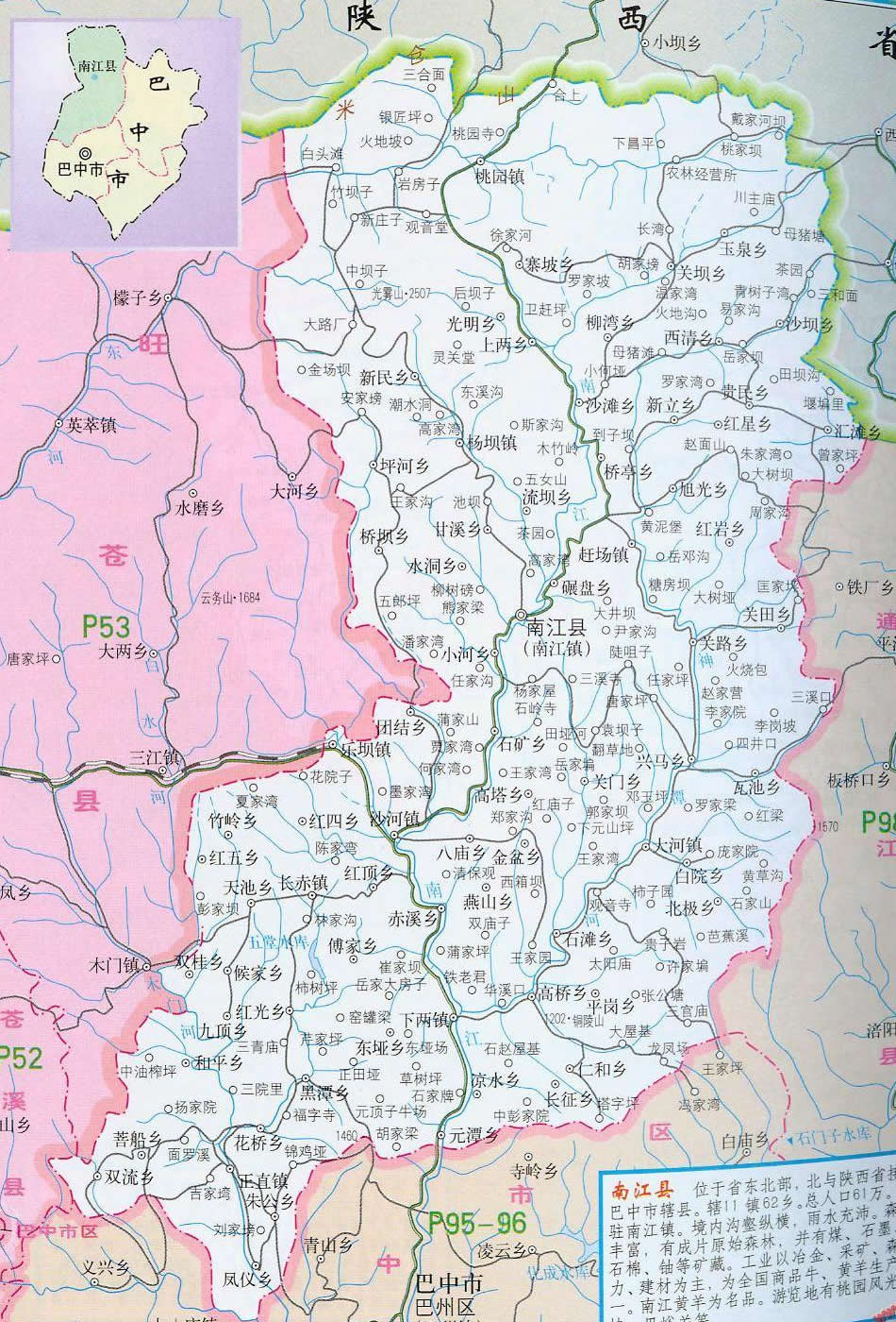 南江縣位于四川北緣米倉山南麓,東鄰?fù)ń辖影椭,西界旺蒼,北靠陜西省南鄭縣。南江古屬巴國,后為集州,先秦兩漢就有政區(qū)建置。南北朝時(shí)期的梁普通六年(公元525年)始建難江縣(取江水難涉之意),距今1480年,明正德十一年(公元1516年)改難江縣為南江縣(江水繞城南而名)至今。 幅員面積3383平方公里,有耕地42.3萬畝;總?cè)丝?5萬人,總戶數(shù)20.2萬戶。全縣轄48個(gè)鄉(xiāng)鎮(zhèn),522個(gè)村,2408個(gè)村民小組,86個(gè)居民委員會。