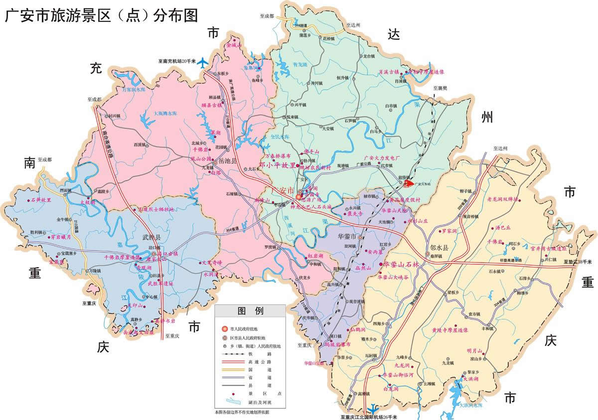 廣安市轄2個(gè)市轄區(qū)、3個(gè)縣、代管1個(gè)縣級(jí)市: