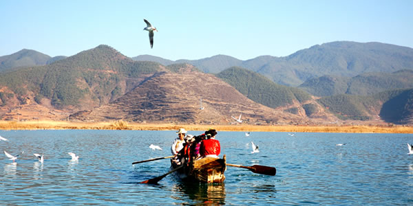 ▲草 海 15000畝草海,是鑲嵌在瀘沽湖東面的翡翠。37種水生植物,42種珍禽異鳥,再加之11種魚、蝦、貝、螺、蛙,構(gòu)成罕見的生物大觀園。草海內(nèi)蘆葦如墻,水路錯綜,紅衣白裙的摩梭姑娘劃著豬槽船出沒其中,悠揚的“啊哈吧啦”民歌在水草叢中回蕩。這份自在,這份逍遙,心又醉了,人也癡了。