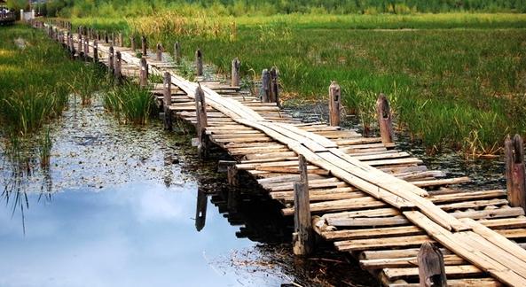 ▲走婚橋 生活在“母系家庭”的摩梭人,奉行“男不娶,女不嫁”的“走婚”習俗。這座橫跨草海、連接兩岸村落的木橋,長達300余米,為“走婚”的“阿夏”提供了便捷的通道。“天下第一愛情鵲橋。”