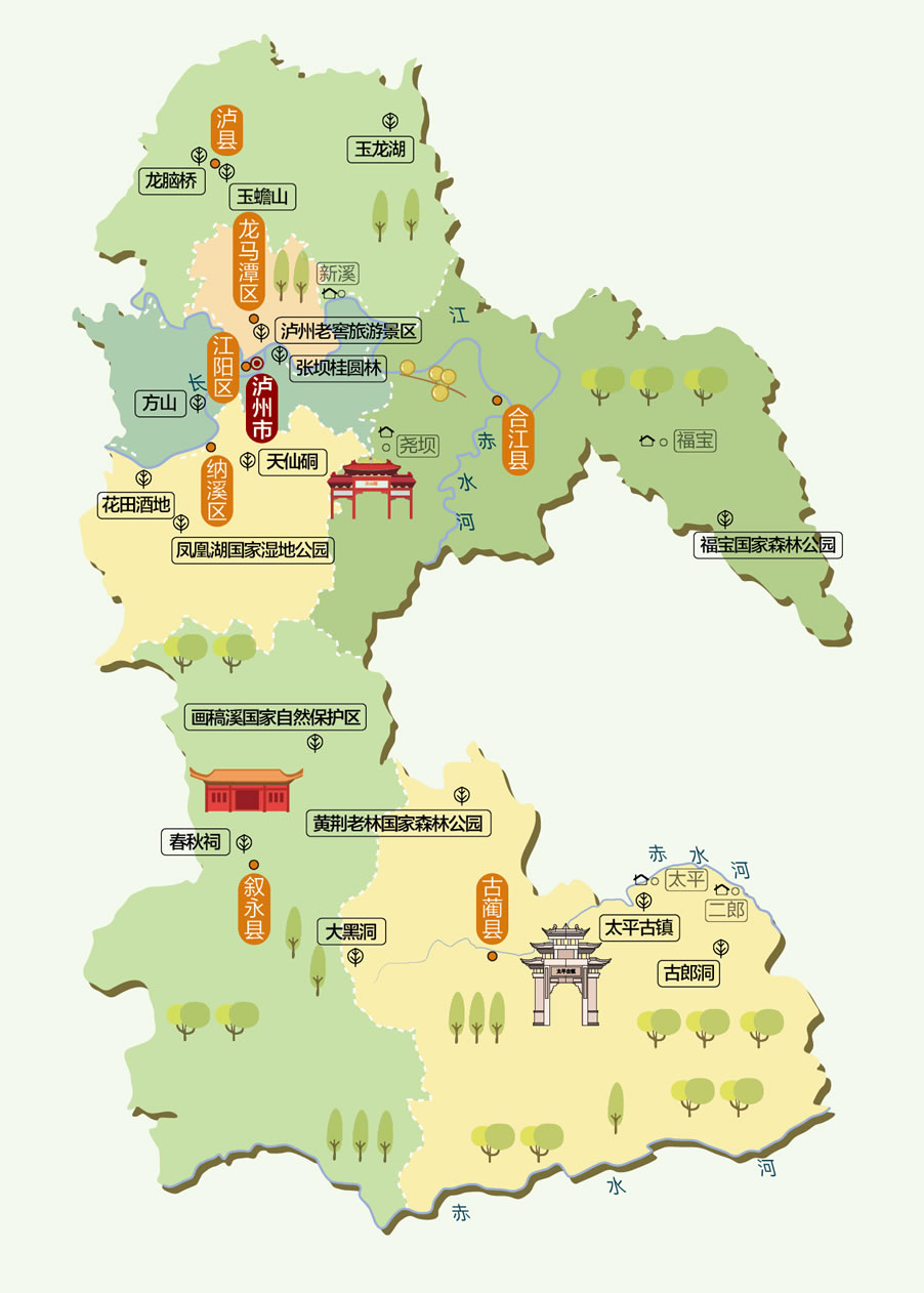 ·方山 ·海潮湖 ·紅龍湖 ·天仙洞 ·龍腦橋 ·瀘州大曲老窖池