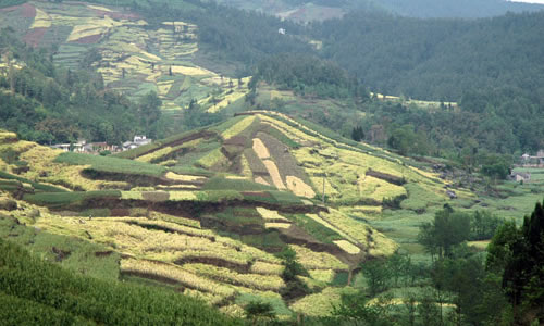 含增鎮(zhèn)屬丘陵、高山相間地形; 盤江(通口河)東岸的吳家后山、乾元山為大山地帶,東南麓為丘陵。最高海拔為2106米,最低海拔540米,地型起伏變化大,地貌大多為喀什特,基巖溶洞陡坎多,巖石裸露地面多, 地質(zhì)多為石灰石風(fēng)化層,境內(nèi)年降雨量700--1200毫米左右,氣溫較低,年平均氣溫15℃,平均日照900時左右,林木生長茂密,屬國家天然林天保護(hù)區(qū)。2000年底,該鎮(zhèn)有耕地面積6214.8畝, 其中田1791畝,地4423.8畝,天然林保護(hù)面積73130畝,森林覆蓋率55%,糧食作物主要以玉米、水稻、小麥為主, 油料作物以油菜、花生為主,經(jīng)濟(jì)作物主要有生姜、大蒜、海椒、薇菜等。養(yǎng)殖業(yè)以養(yǎng)豬、羊、牛為主,小家禽有雞、鴨、鵝、兔等。