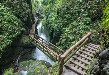 五龍溝古稱蠻河溝,長(zhǎng)約8千米,因傳說(shuō)古時(shí)有五條神龍隱藏于溝中而得名。其中的景色有金娃娃沱,景色絕佳的龍隱峽棧道,石筍巖,回音壁等。
