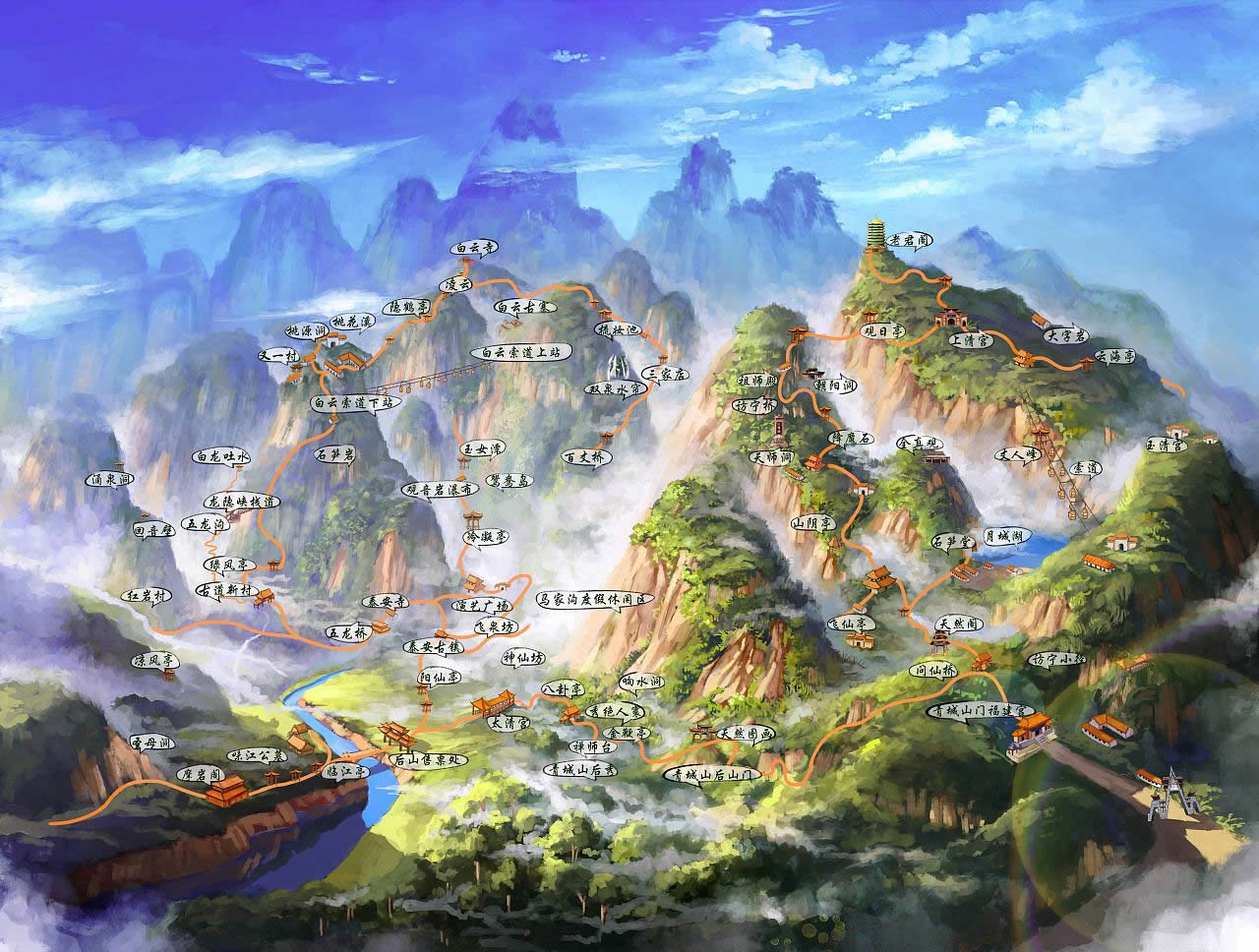 青城山分前、后山。前山是青城山風(fēng)景名勝區(qū)的主體部分,約15平方千米,景色優(yōu)美,文物古跡眾多,主要景點(diǎn)有建福宮、天然圖畫、天師洞、朝陽(yáng)洞、祖師殿、上清宮等;后山總面積100平方千米,水秀、林幽、山雄,高不可攀,直上而去,冬天則寒氣逼人、夏天則涼爽無(wú)比,主要景點(diǎn)有金壁天倉(cāng)、圣母洞、山泉霧潭、白云群洞、天橋奇景等。