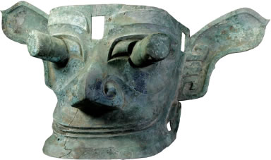商銅縱目面具:此文物為商代的青銅器,面具呈方型,倒八字形刀眉,眉尖上挑,雙眼斜長(zhǎng),眼球極度夸張;耳尖部呈桃尖狀;鷹鉤鼻,口角深長(zhǎng)上揚(yáng),似微露舌尖,作神秘微笑狀;下頜前伸;額部正中有一方孔。現(xiàn)收藏于三星堆博物館。