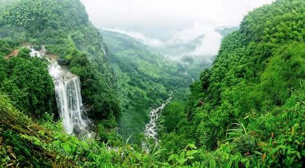 七彩飛瀑又名落魂臺。《江安縣志》載:“萬嶺箐南北飛瀑,殆似廬山”。不擇地而出的泉水,使得深邃幽深的竹海充滿靈氣,山巖跌宕處,每每作了懸泉飛瀑。山間數(shù)十條姿態(tài)各異的瀑布中,最為壯觀的,當(dāng)數(shù)七彩飛瀑。七彩飛瀑處在石鼓山和石鑼山之間的葫蘆谷中,從深林里流出的水潦河,在回龍橋下分為四級瀉下懸崖,落差近200米,蔚為壯觀。瀑布上頭,還有石龍過江、孟獲墳、古較場等景點。一湖碧水映藍(lán)天翠竹;湖水的寧靜,與瀑布的飛動相互映照。