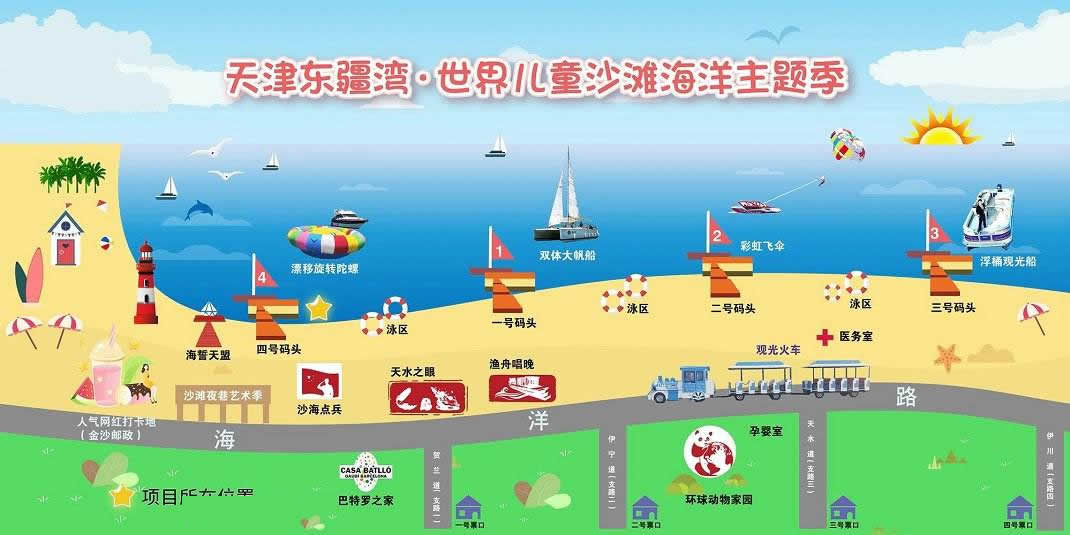 景區(qū)還將增添激情水上飛碟、快艇漂移、水上沙發(fā)、水上UU船、帆船、海上滑梯、海上蹺蹺板等數(shù)十項(xiàng)大型游樂(lè)設(shè)施,讓這里真正成為海上“迪士尼”。作為配套設(shè)施,在人工海灘西側(cè)修建濱海路,全長(zhǎng)1.3公里,道路寬24米,為景區(qū)內(nèi)步行觀景道路,道路兩側(cè)綠化面積約6700平方米。綠化廣場(chǎng)總面積12萬(wàn)平方米,景區(qū)停車場(chǎng)總面積約4700平方米。景區(qū)設(shè)置為沙灘親水區(qū)、沙灘游泳休閑區(qū)、水上運(yùn)動(dòng)休閑中心和水上休閑娛樂(lè)區(qū)。其中,位于沙灘游泳休閑區(qū)已經(jīng)建成的海景會(huì)所,是目前國(guó)內(nèi)北方最大的單體木結(jié)構(gòu)海景酒店會(huì)所,設(shè)有餐飲、住宿、淋浴、商務(wù)、娛樂(lè)等設(shè)施,并提供有地道的天津狗不理包子。另外,會(huì)所周邊正在建設(shè)游艇會(huì)所、五星級(jí)酒店、運(yùn)動(dòng)廣場(chǎng)、低密度住宅、高爾夫球場(chǎng)等設(shè)施。配套服務(wù)設(shè)施將逐步完善。