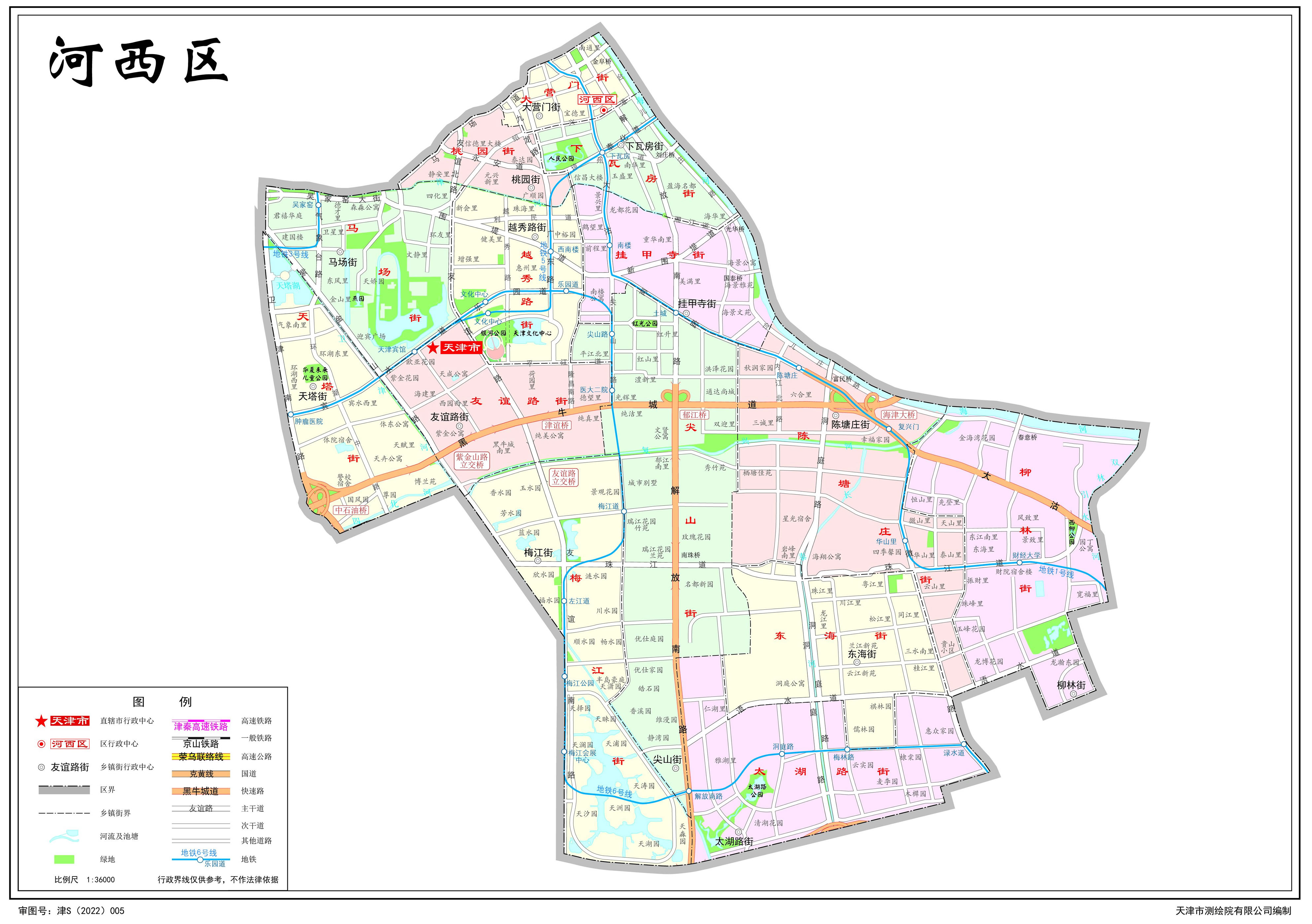 河西區(qū)轄14個街道:大營門街道、下瓦房街道、桃園街道、掛甲寺街道、馬場街道、越秀路街道、友誼路街道、天塔街道、尖山街道、陳塘莊街道、柳林街道、東海街道、梅江街道、太湖路街