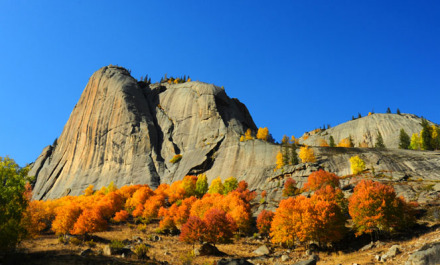 神鐘山,又名阿米爾薩拉峰,為一座如鐘似錐的花崗巖奇峰,在額河南岸平地拔起,海拔1608米,相對高差達(dá)365米,為阿爾泰山山景之最。巖壁縫上生長著白樺樹、青松和西伯利亞云杉。因巖體發(fā)育平行山坡面的同心圓層狀節(jié)理,受寒凍風(fēng)化作用,沿平行坡面的節(jié)理不斷地拆離崩解垮塌,使山峰的表面既圓潤平滑,又十分陡峭,從而形成鐘狀地貌。