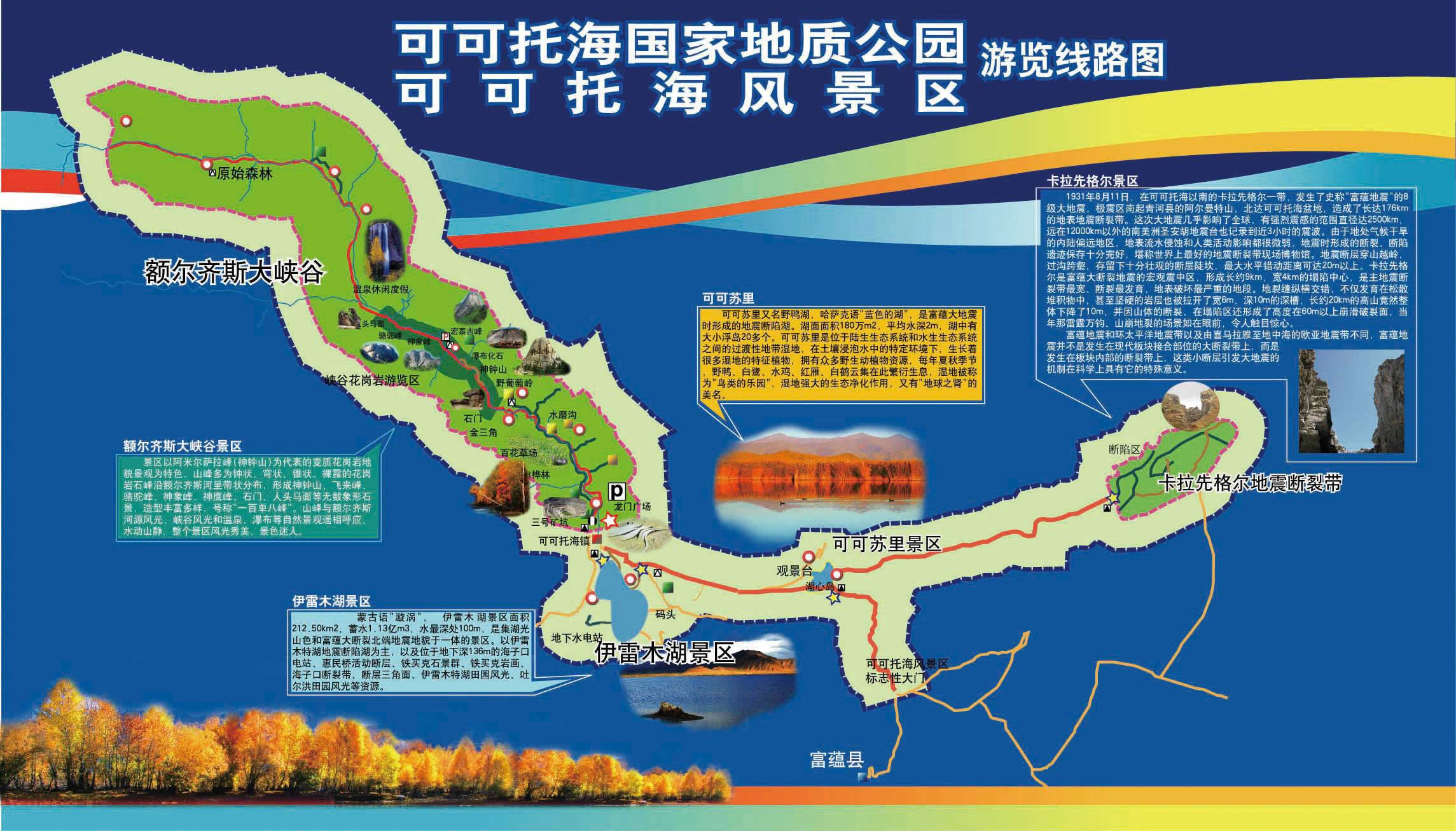 景區(qū)由額爾齊斯大峽谷、可可蘇里、伊雷木特湖、卡拉先格爾地震斷裂帶四部分組成。它以優(yōu)美的峽谷河流、山石林地、礦產(chǎn)資源、寒極湖泊和奇異的地震斷裂帶為自然景色,融地質(zhì)文化、地域特色、民族風(fēng)情于一體,以觀光旅游、休閑度假、特種旅游(徒步、攝影等)、科學(xué)考察等為主要特色的大型旅游景區(qū)。