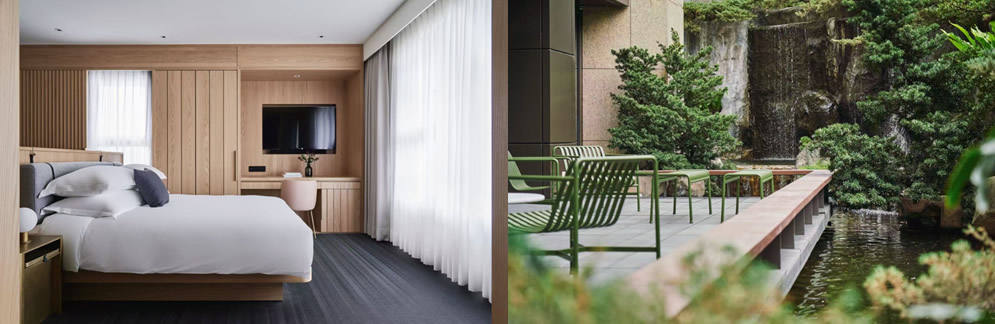 臺北金普頓大安酒店為金普頓品牌亞洲首店,位于臺北東區(qū)靜謐街巷,與購物中心和捷運站僅隔一街,周邊遍布文藝畫廊、精品店與人文咖啡館,雖鄰喧囂卻宛如都市靜謐方舟。129間客房與套房融合復(fù)古與白瓷層疊美學(xué),與透光天井相呼應(yīng),處處彰顯設(shè)計巧思。12樓摩登餐酒館The Tavernist為米其林指南推薦餐廳,寬敞露臺可俯瞰臺北城景與臺北101。酒店設(shè)施完善,包括24小時健身房及每日“社交時光”,賓客可盡享設(shè)計感與都市雅致。