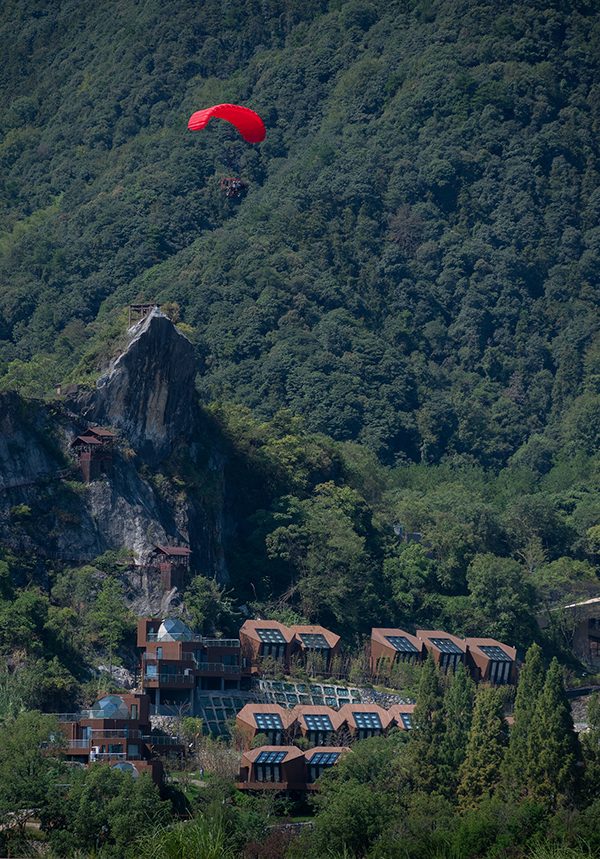 架空設(shè)計(jì)的海螺屋客房隱于林間,如同童話故事中的精靈居所,為住客營(yíng)造出私密而夢(mèng)幻的休憩空間;天文臺(tái)客房懸于巖壁之上,通過客廳的望遠(yuǎn)鏡和全景天窗可賞星河美景,將浩瀚星空引入室內(nèi);炭晶舍客房以傳統(tǒng)炭雕藝術(shù)為靈感,通體的炭黑色藝術(shù)感十足,展現(xiàn)出材料與自然的深度對(duì)話;復(fù)式結(jié)構(gòu)的玉江舍客房,則讓賓客在空間轉(zhuǎn)換中,收獲山川、江潮等不同的觀景視野,實(shí)現(xiàn)移步換景的居住意境。