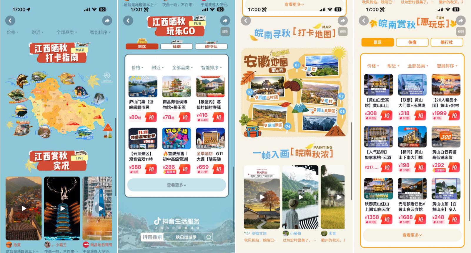 抖音深度響應(yīng)用戶對(duì)季節(jié)限定體驗(yàn)的需求,以“秋日儀式感”為切入點(diǎn),聯(lián)動(dòng)江西和安徽多城自然人文類商家,分別發(fā)起#來(lái)江西曬個(gè)秋 與#賞皖南秋意濃 話題活動(dòng),累計(jì)收獲話題總播放量2945萬(wàn),用戶投稿4275條,相關(guān)搜索UV突破406萬(wàn),同比增長(zhǎng)19%。從江西婺源的篁嶺景區(qū)到安徽黃山的三塔景區(qū),從葛仙村的千燈夜游到三清山的云海勝景,抖音平臺(tái)的內(nèi)容生態(tài)與交易場(chǎng)景實(shí)現(xiàn)深度融合,推動(dòng)江西與安徽兩地文旅目的地整體支付達(dá)GMV2.22億元,同比增長(zhǎng)246%,讓從發(fā)現(xiàn)出行靈感至完成目的地消費(fèi)的全過(guò)程更加順暢自然。