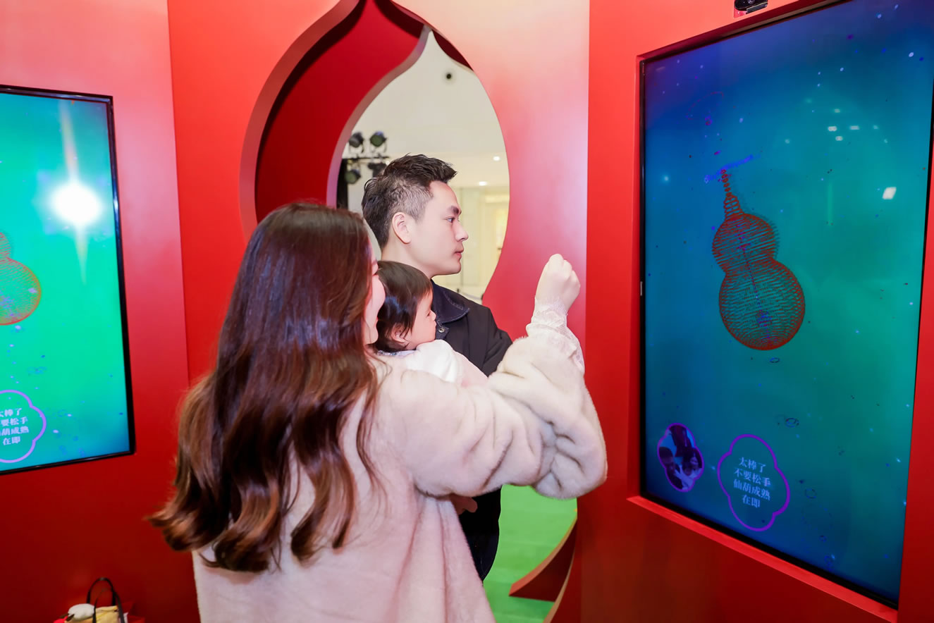 山水,并非遠(yuǎn)行才可得見(jiàn)。書法水墨藝術(shù)家劉玥首展作品《春山行遠(yuǎn)圖》以20米巨幅“山水開(kāi)卷”,步入其中,與天地春意從容照面;紅色的帷幔落于銀色的松枝上,就像于山間松下靜謐的一隅,“幕下棲心”將是絕佳開(kāi)年時(shí)尚大片的打卡處;松下銀椅,為你與摯友“漫敘往來(lái)”的相聚時(shí)刻營(yíng)造出寧?kù)o、松弛的氛圍;多寶閣中陳列著未經(jīng)雕琢的茶器素胚與場(chǎng)內(nèi)品牌萬(wàn)仟堂,長(zhǎng)沙尼依格羅酒店及tea'stone帶來(lái)的新春茶器,以“初芒蘊(yùn)能”詮釋著未來(lái)的無(wú)限可能與新生力量。轉(zhuǎn)身與“蒔光種愿” 四方亭相遇。葫蘆門朝四方而開(kāi),寓意著納四方福祿,步入其中,與數(shù)字交互藝術(shù)家吳旭首展作品《無(wú)限福祿》體驗(yàn)互動(dòng),跟隨指引揮動(dòng)手勢(shì),觸發(fā)粒子凝聚為動(dòng)態(tài)“福”字,親手完成一場(chǎng)新春祈福儀式。我們把象征團(tuán)圓與喜悅的紅色沙發(fā)打造“盞間聚暖”,如懷抱般圍合的布局作為“歸處”的隱喻。與家人團(tuán)聚便是心歸處,這將是中國(guó)年最圓滿的意象。