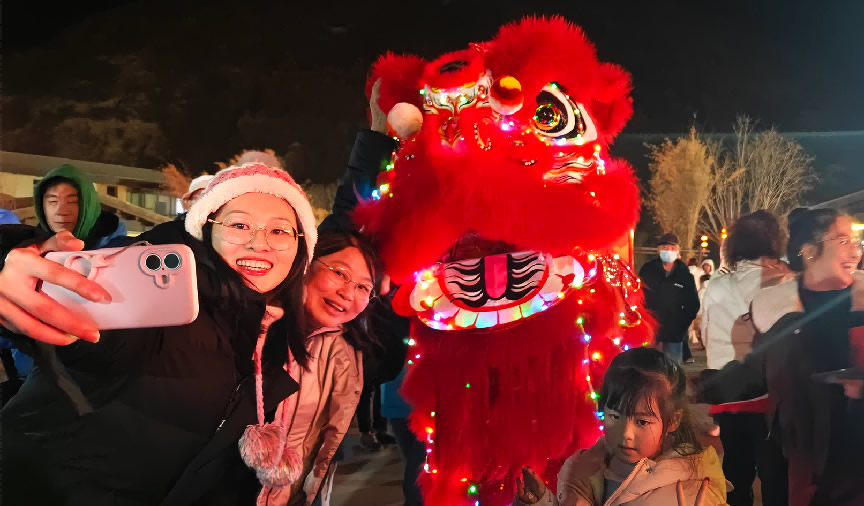 游客與度假區(qū)內(nèi)的福獅合影互動,討個(gè)新年“好彩頭”。