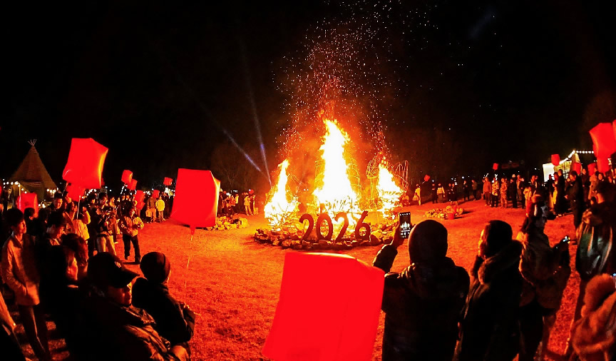 在京南華美勝地,游客們歡聚一堂,點(diǎn)燃跨年篝火,慶祝新年到來。