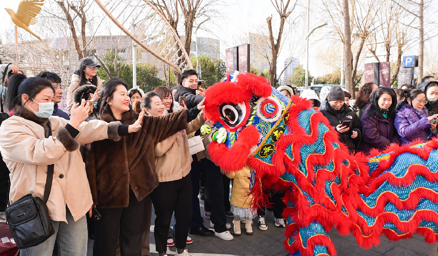大年初一,購物中心的舞獅隊(duì)伍來到戶外與市民互動,送上新年祝福。