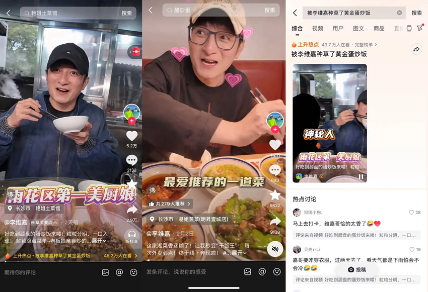 除了政務(wù)聯(lián)動,明星探店更是為湘菜引流添柴加火,讓長沙味道徹底出圈。本土熟面孔李維嘉強(qiáng)勢加盟,帶來系列探店內(nèi)容,用接地氣的講解、沉浸式的品嘗,帶大家走進(jìn)長沙街巷深處的兩處寶藏湘菜館——艷姐土菜館、易姐蒸菜,解鎖藏在煙火里的地道風(fēng)味,每一條視頻都充滿煙火氣與趣味性,精準(zhǔn)戳中網(wǎng)友味蕾,無數(shù)網(wǎng)友被李維嘉種草了黃金蛋炒飯。