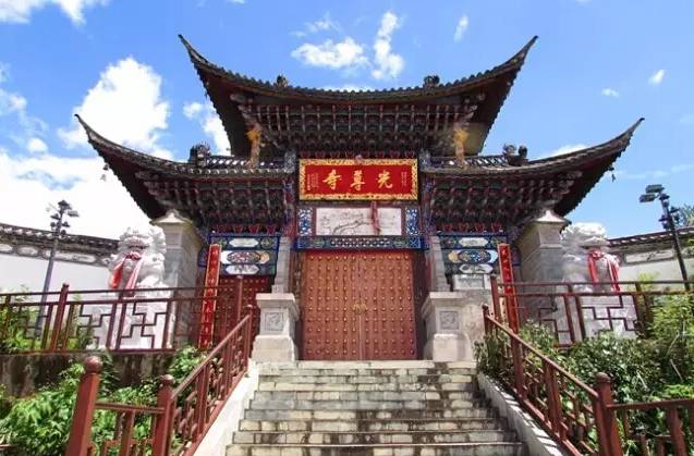 保山光尊寺,位于隆陽區(qū)板橋鎮(zhèn)世科村后的五鳳朝陽山。唐天寶二年(743年),南詔王皮邏閣為祭祀佛教尊神而建。座東朝西,依山形筑成七進(jìn)五院,計(jì)有建筑物23幢,占地面積9000余平方米。是古代保山典型的三教合一的寺廟,又是保山現(xiàn)存寺廟規(guī)模最大的建筑群。太平洋戰(zhàn)爭爆發(fā)時期,中國遠(yuǎn)征軍在此處設(shè)滇西抗戰(zhàn)指揮部。