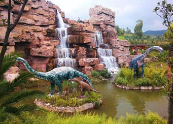 自然的山谷地貌,加上人工修筑的瀑布、河流、湖泊,和以大量的侏羅紀(jì)時(shí)期的植物景觀營造出翠綠的山谷、茂密的叢林、壁立的山崖、從山崖上跌宕而下的大瀑布,在潭邊和叢林里飲水覓食的恐龍、在沙丘邊沼澤地追逐爭(zhēng)斗的恐龍、高大的樹林里若隱若現(xiàn)的巨大梁龍。