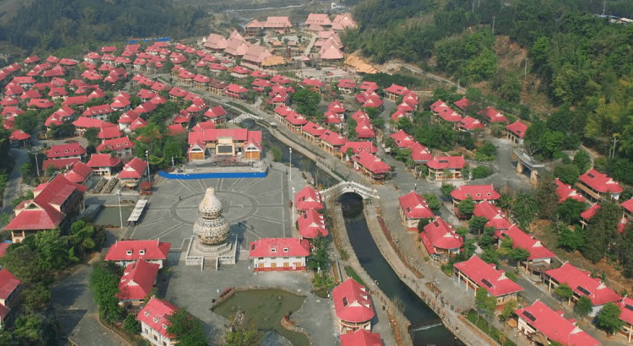 葫蘆小鎮(zhèn)位于滄源縣城西南3千米處,于2013年建設(shè)完工,小鎮(zhèn)占地面積202畝,共有民居180戶,建筑風(fēng)格保留佤族民居獨有的建筑特點,外形特征為紅色弧形屋頂及屋角裝飾交叉角。小鎮(zhèn)180棟紅色弧形屋頂特色民居與文化墻、噴水葫蘆、打歌廣場、寨心磚、葫蘆塔、佤王府等佤族特色建筑巧妙地融合在一起。