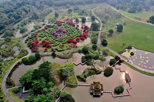百花園為中國科學(xué)院西雙版納熱帶植物園的第一景,占地面積353畝,現(xiàn)收集保存與展示熱帶花卉植物645種(品種)。百花園植物布景主要采用孤植、純林大片種植、同類多品種集中收集、?茖俦4、攀緣及水生花卉植物多種方式展示。并力求與地形水域巧妙結(jié)合,形成不同的賞景空間,創(chuàng)造“天女散花”、“層林盡染”、“五彩繽紛”和“花開花落”等景觀效果。借助區(qū)內(nèi)大量花卉植物,通過挖掘花卉與人們?nèi)粘I、信仰和情感的關(guān)聯(lián),以及古往今來的文人墨客以花卉植物創(chuàng)作出的傳說故事、詩歌等文學(xué)作品,以對(duì)聯(lián)、字畫、牌匾等形式展示于園區(qū)內(nèi),充分展示花卉植物的科學(xué)和文化內(nèi)涵。
