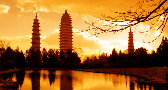大理崇圣寺三塔,距離下關(guān)14公里,位于大理以北1.5公里蒼山應(yīng)樂峰下,背靠蒼山,面臨洱海,三塔由一大二小三座佛塔組成,呈鼎立之態(tài),遠(yuǎn)遠(yuǎn)望去,雄渾壯麗,是蒼洱勝景之一。