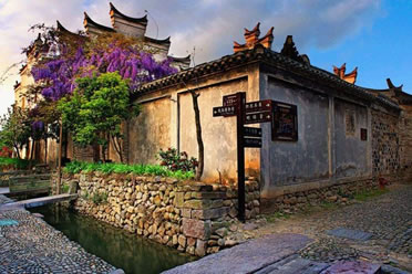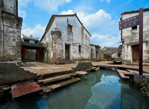 村落按“回”字九宮八卦式布局。童姓祖先按照八卦原理,把白溪水引進(jìn)村莊,潺潺溪水挨戶環(huán)流,人人可在溪水中洗菜凈衣,家家連流水小橋,戶戶通卵石坦途。青藤白墻黑瓦,石頭鏤花窗戶,雕梁畫(huà)棟門樓,蒼涼中顯現(xiàn)出昔日曾經(jīng)的繁華。